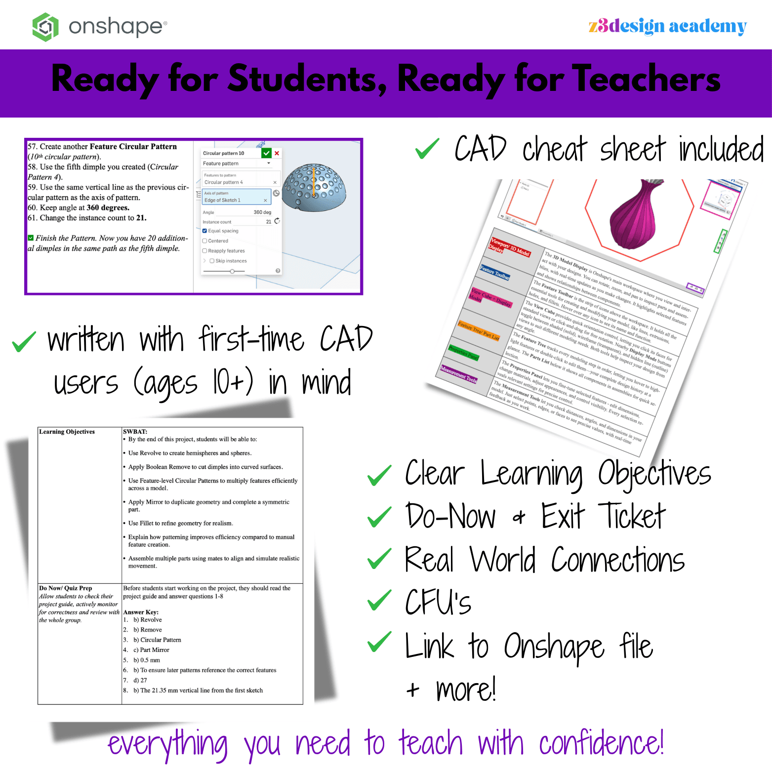 Explore classroom-tested STEM and design resources developed to make complex concepts easy to teach and engaging to learn. Each curriculum pack includes editable project guides, Onshape models, and hands-on challenges designed for immediate use in the classroom.